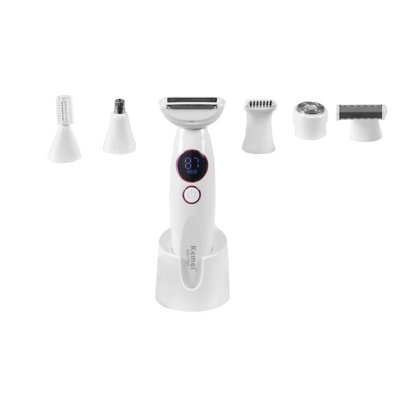 - ماشین اصلاح مو صورت و بدن بانوان مدل km-7101 دارای ۶ سری اصلاح شامل سری اصلاح ابرو ، سری شیور اصلاح مو بدن ، سری اصلاح مو بینی و گوش ، سری اصلاح مو صورت ، سری اصلاح نواحی حساس ، سری اصلاح مو بدن میباشد . این دستگاه ضدآب میباشد و با ۹۰ دقیقه شارژ ۹۰ دقیقه کارکرد دارد یکی دیگر از مزیت های این دستگاه شانه های زیاد آن است که شامل ۹ عدد شانه از سایز ریز تا درشت را دارا است